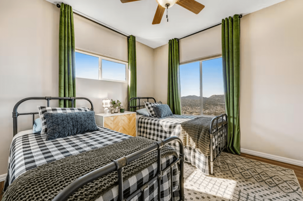 The living and dining area windows offer sweeping views of the surrounding landscape. Step out onto the furnished balcony for a closer view. Take in the fresh, desert air and watch the sunset. Back inside, meet up around the dining table for meal times. The table seats six comfortably while the island bar offers additional seating. The pristine kitchen offers granite countertops, stainless steel appliances, and plenty of prep space for the chef of the group.