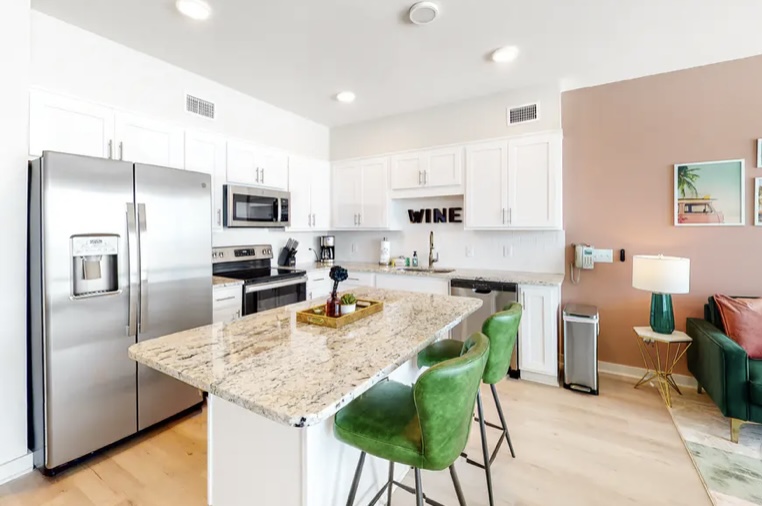 Find yourself right on the sugar-white sand of Gulf Shores here at Sea Glass #202! The interior of this newly built getaway, featuring one bedroom and a bunk room, will charm each guest in no time, as everyone will be greeted by the powder pink accents, retro furnishings, and modern decor that give this space a truly eclectic feel. Wake up each day and open the sliding glass door leading to the balcony to listen to the tide as you whip up a tasty breakfast in the full kitchen. As soon as days heat up, slip into your favorite bathing suit and rub in some sunscreen before heading down to the shared pool to read a book or watch the kiddos play Marco Polo nearby. For even more excitement, pack a picnic and walk to the sand to relax with a good book in hand. When the stars come out, the kids will fall in love with the bunk room and the adults can retreat to the main tropical-themed bedroom to hit the hay and recuperate for another day of coastal adventure. Plus, there will be no need to worry about stocking up on groceries, as this condo is right across the street from a grocery/beach supply store! Don’t hesitate to check out The Hangout as well, a popular spot nearby!